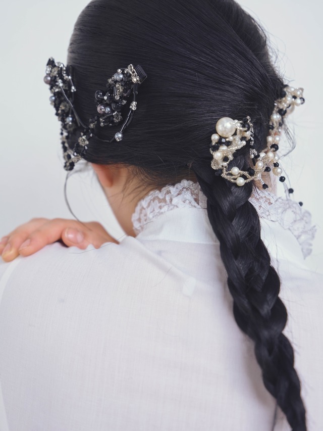 ※こちらの商品はご予約アイテムです。 ※商品出荷はご購入後の1ヶ月半〜2ヶ月半を予定しています。 ※生産の都合によりデリバリー時期が遅れる場合がございます。 〈商品説明〉 une wedding × MIRIA original headpiece une weddingのために、MIRIAが一点ずつお仕立てする特別なヘッドピースです。 それぞれかたちの異なる珊瑚と淡水パールを、 繊細なヴィンテージパーツとともに飾り立てました。 思い出と歳月を静かに重ねてきたパーツたちが、 おふたりの特別な時間にそっと寄り添えますように。 ⸻ 大ぶりの装飾が付いた土台はバレッタ仕様になっており、 どの角度からでも着用いただけるデザインです。 2つの土台を繋ぐパーツはあえて固定せず、 動きに合わせてやわらかく揺れる仕様になっています。 使用する素材はすべて、デザイナーが一点一点セレクト。 淡水パール、珊瑚、シェル、アクリル、ガラスビーズなどに加え、 ヴィンテージの風合いをもつパーツも組み合わせてお仕立てしています。 そのため、装飾のかたちやバランスは一点ずつ異なり、 世界にひとつだけの仕上がりに。 どのようなパーツがどれくらい施されるかは、MIRIAの感性で構成させていただきます。 画像はあくまでサンプルとしてご覧ください。 素材の組み合わせや手仕事ならではの個体差も、 このヘッドピースの魅力としてお楽しみいただけたら嬉しいです。 〈サイズ〉 フリー 〈カラー〉 メインカラー:ホワイト 〈素材〉 バレッタ金具: 鉄 本体: ビーズ(ガラス等)淡水パール 珊瑚 シェル アクリル 一部ヴィンテージパーツ使用のため組成の特性不可のものあり 【先行受注利用規約】 本サイトのご利用にあたり、先行受注利用規約を必ずお読みの上、ご利用ください。 本サイトにて、実際にご購入いただいた場合は、当該ご利用規約に同意したものとみなされますので、ご留意ください。 BASEのシステム上、数ヶ月後の発送処理が不可能なため、一旦配送完了メールをお送りさせていただきます。BASE上では、配送完了となりますが、実際の商品発送はアイテム製作完成後、順次行いますのでご注意くださいませ。 ご不明な点がございましたら下記連絡先までご連絡くださいませ。 [email protected]