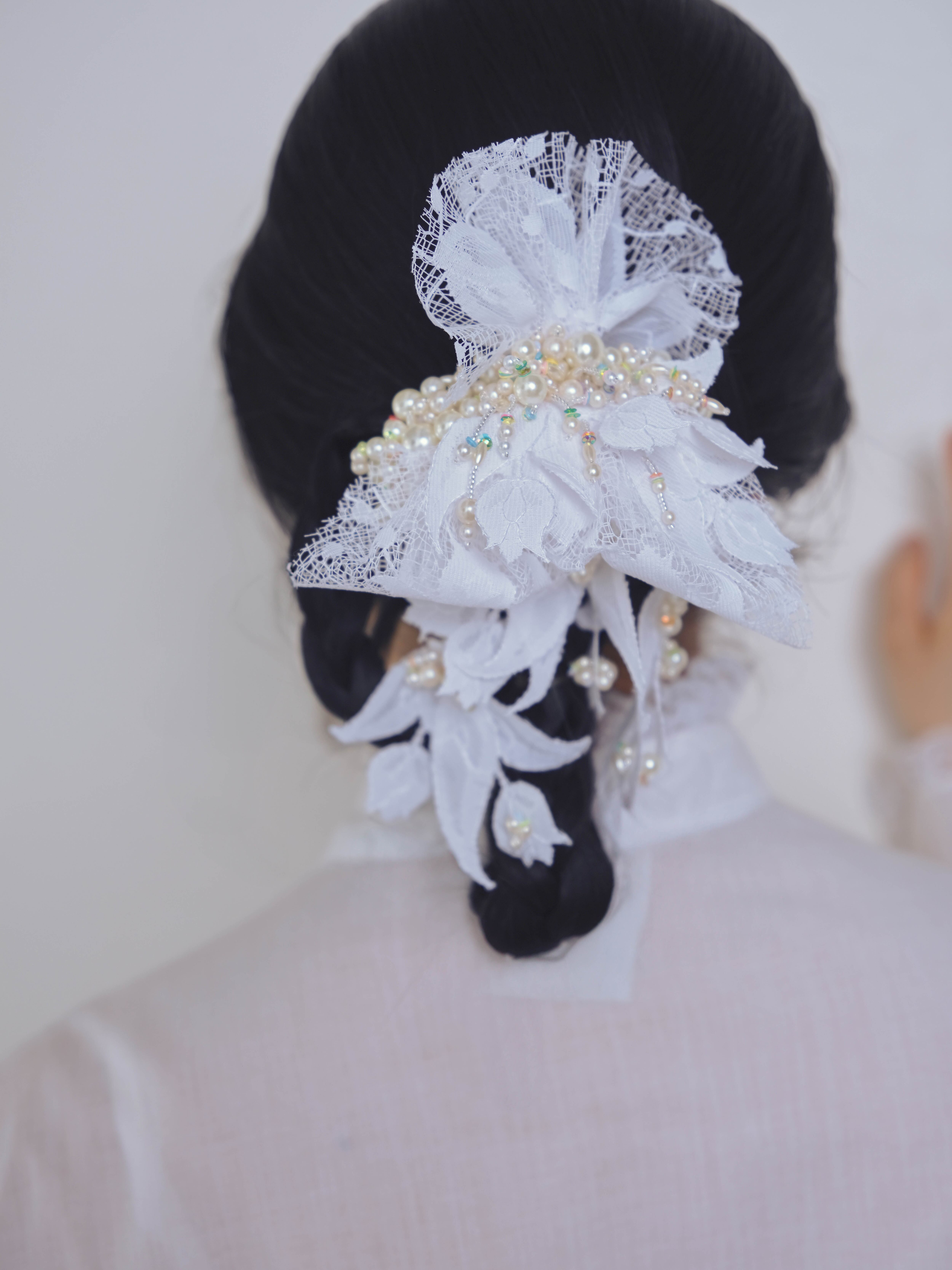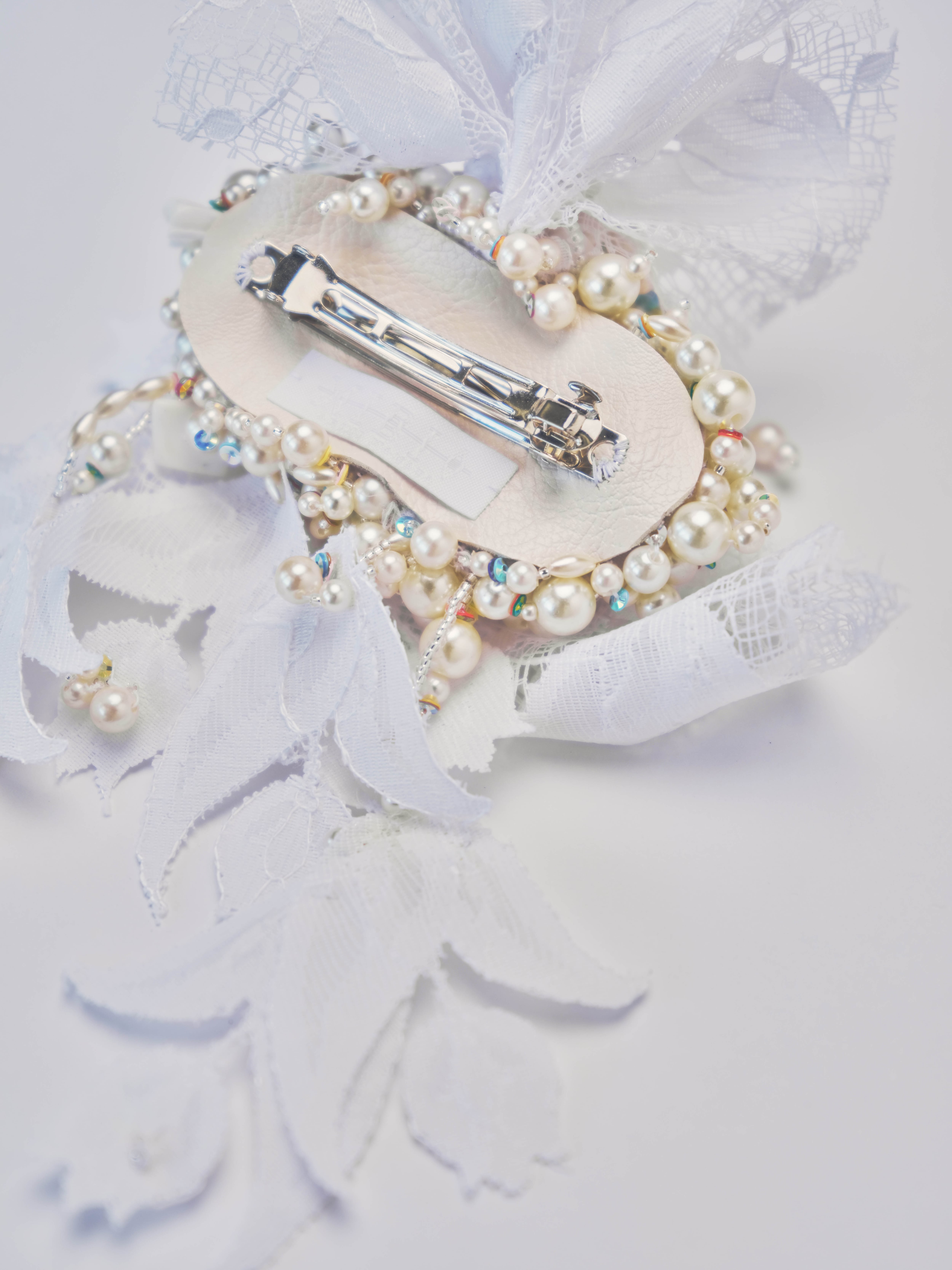 繊細なチューリップレースが髪にふんわりと寄り添い、やさしく華やかな印象を添えるバレッタです。