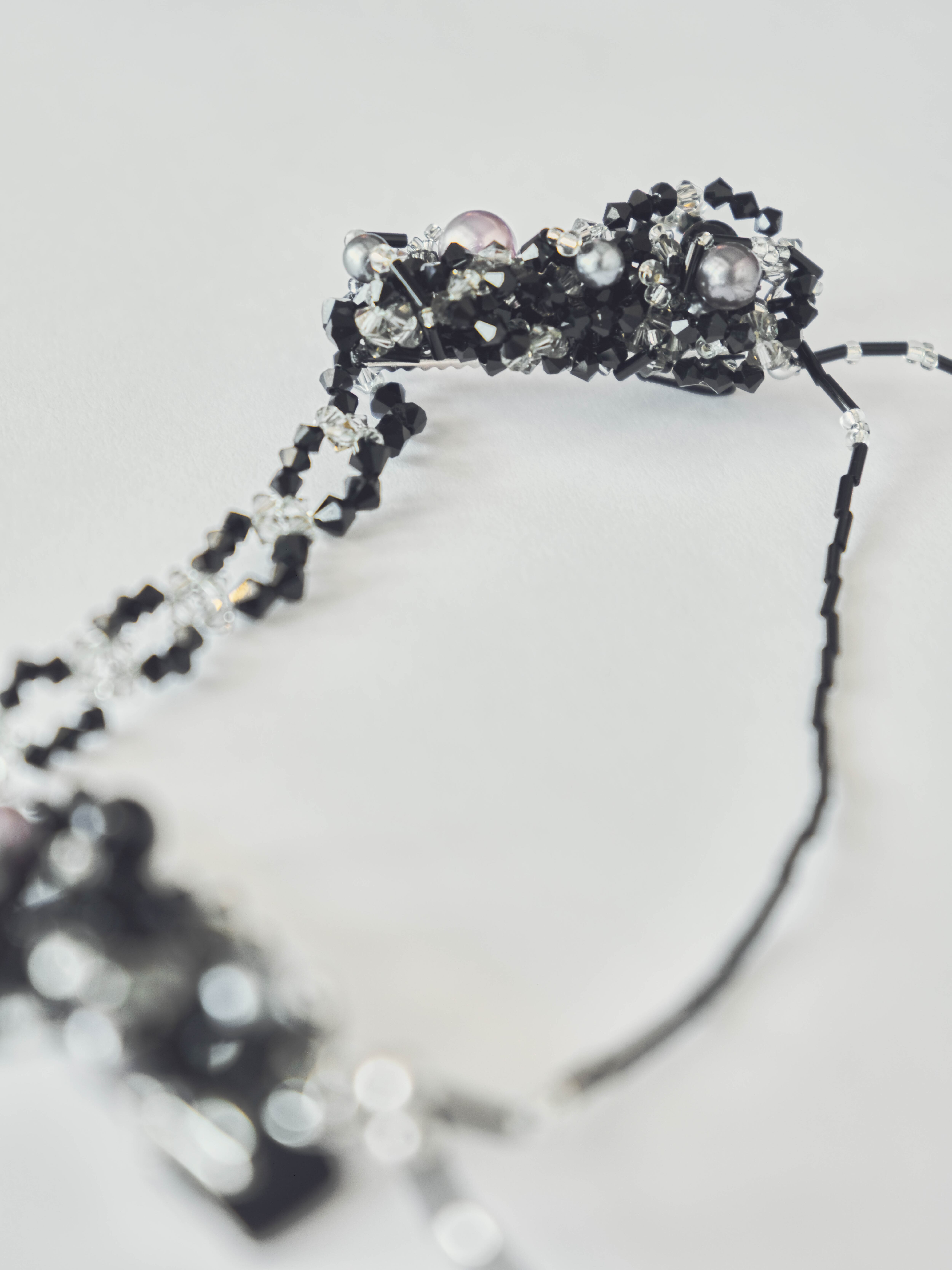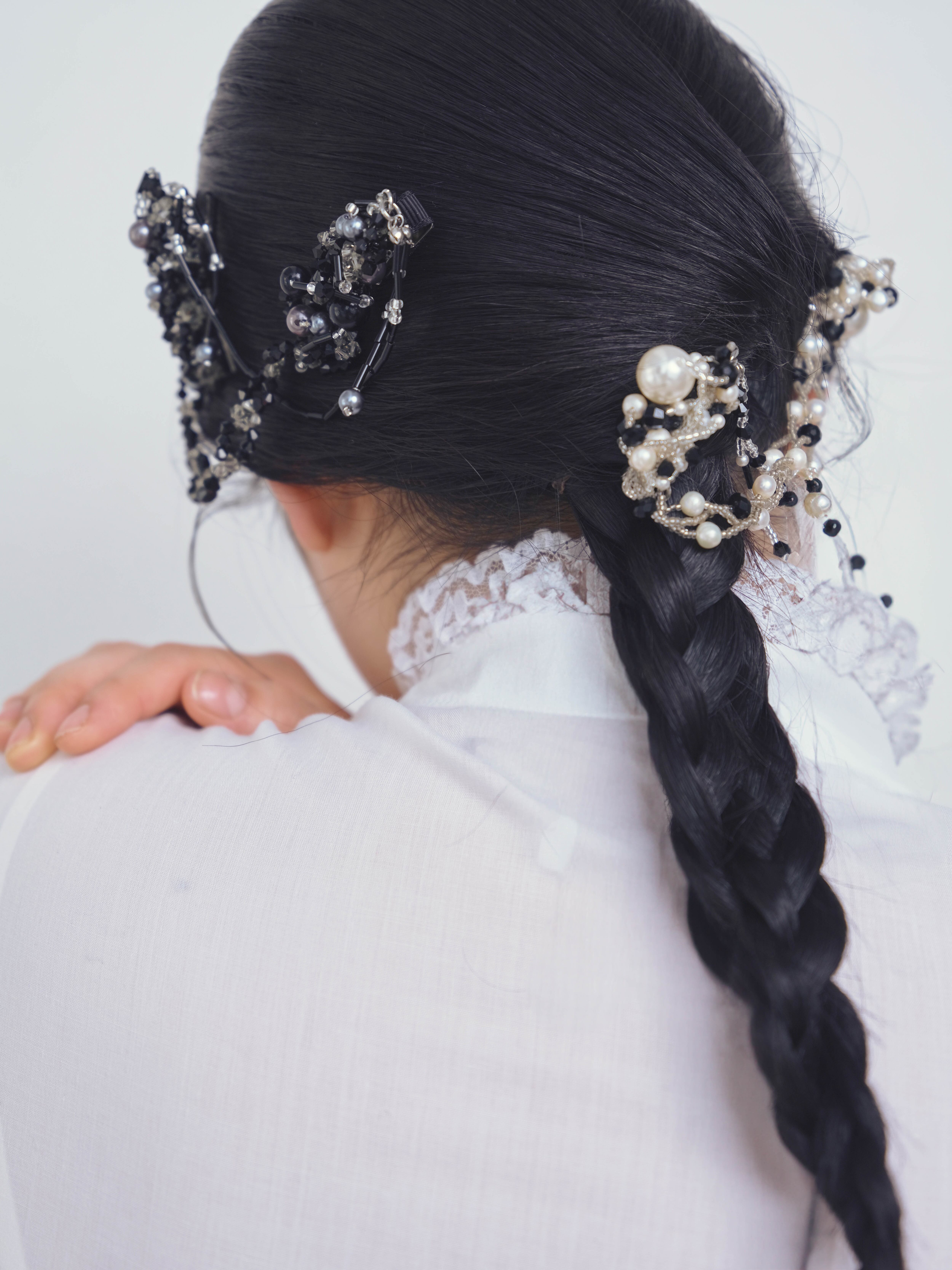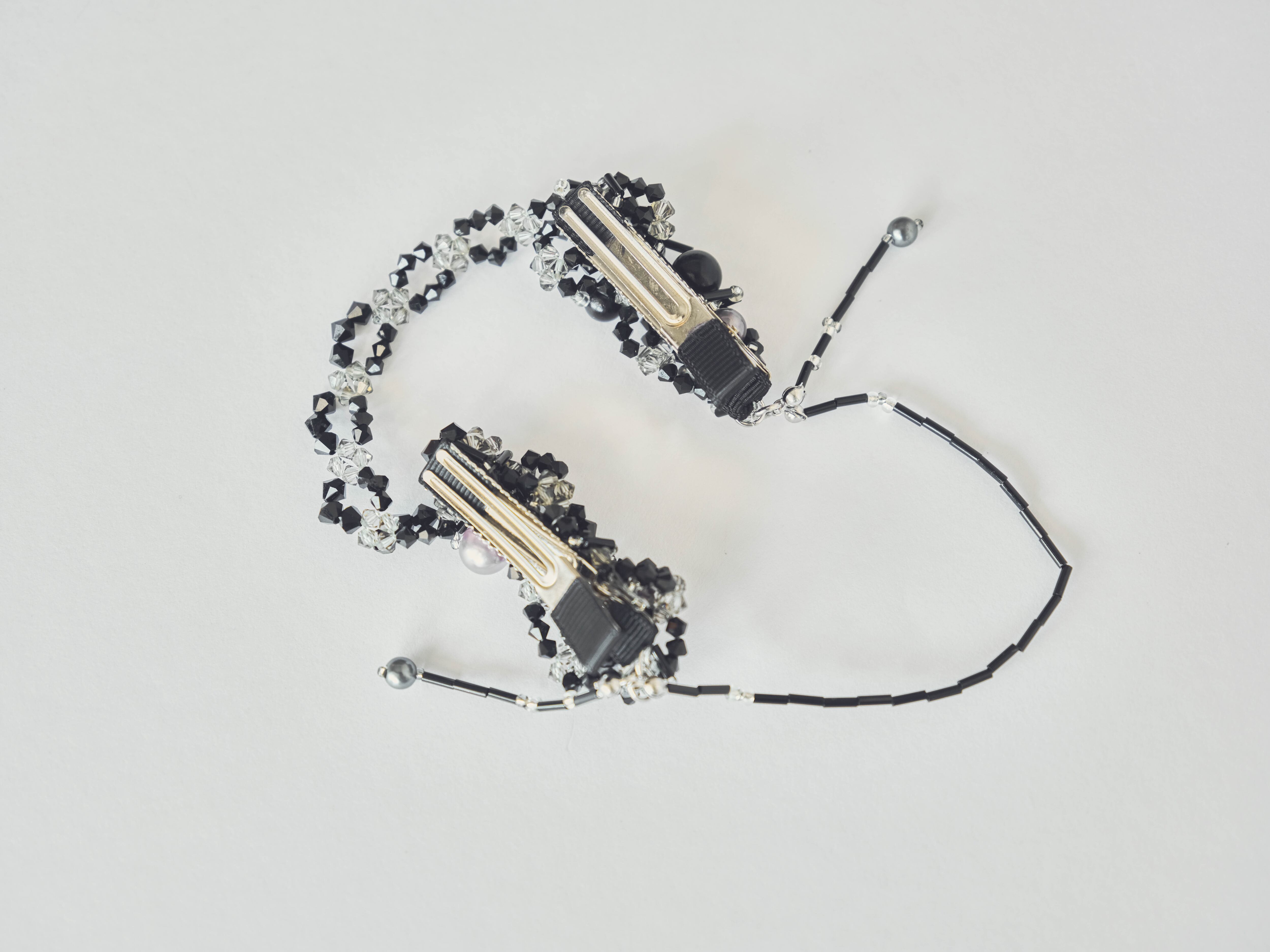・大ぶりの装飾土台がバレッタ(クリップ)になっており、左右どちらからでも着用可能。