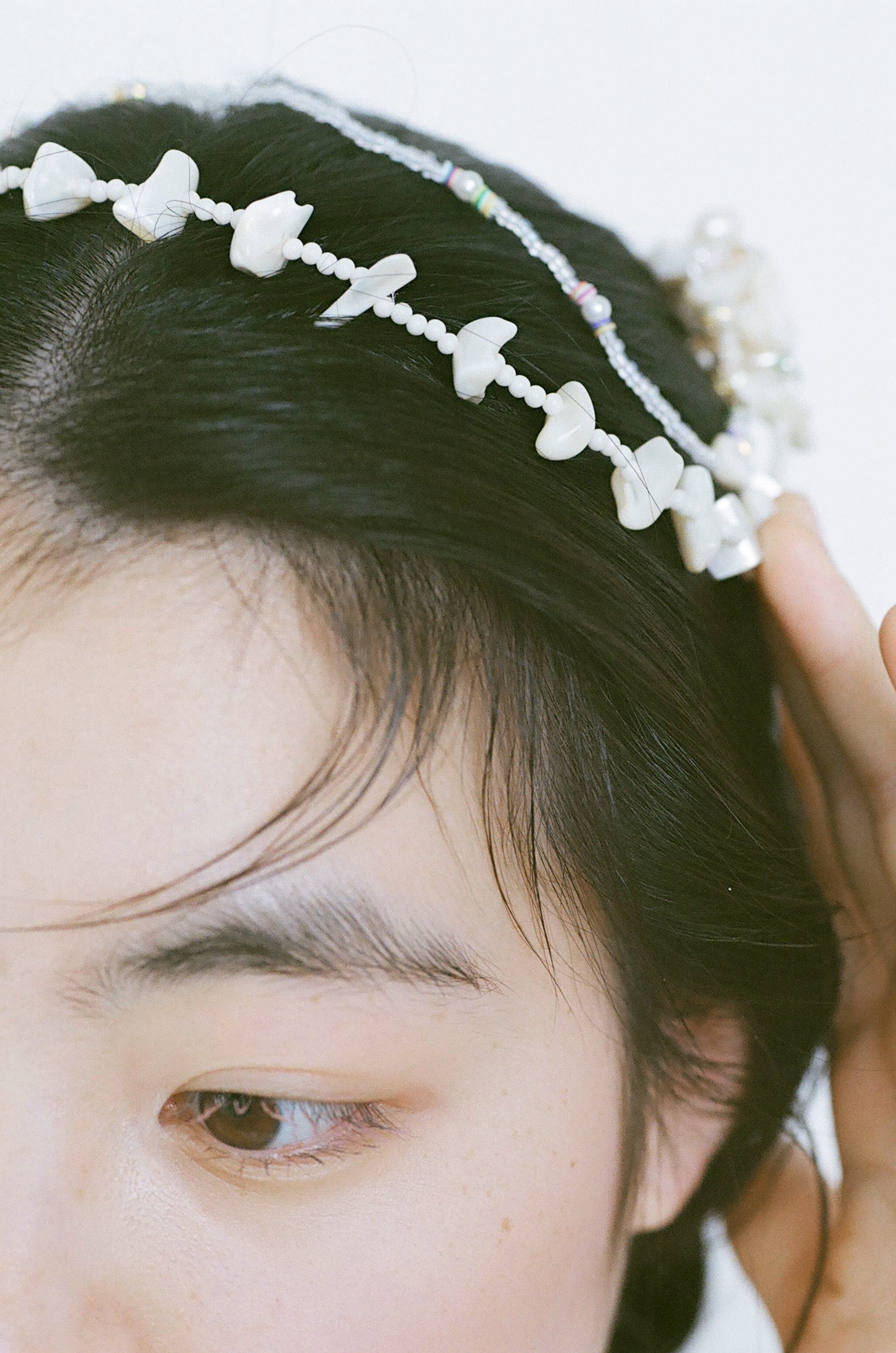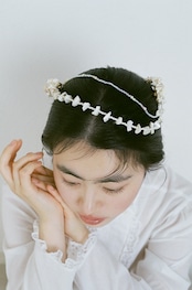 髪にひとつ留めるだけで、空気感のあるコーディネートに。