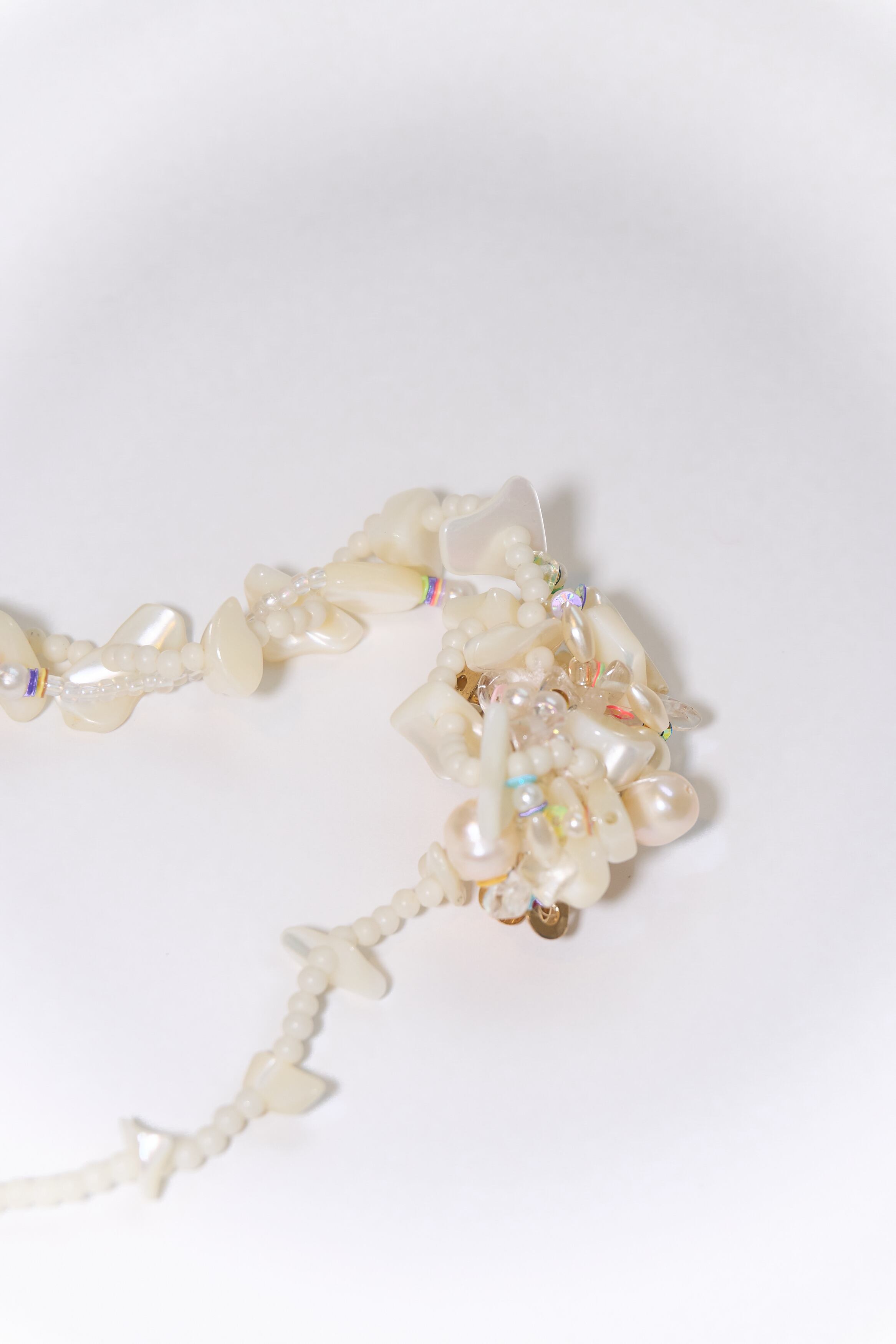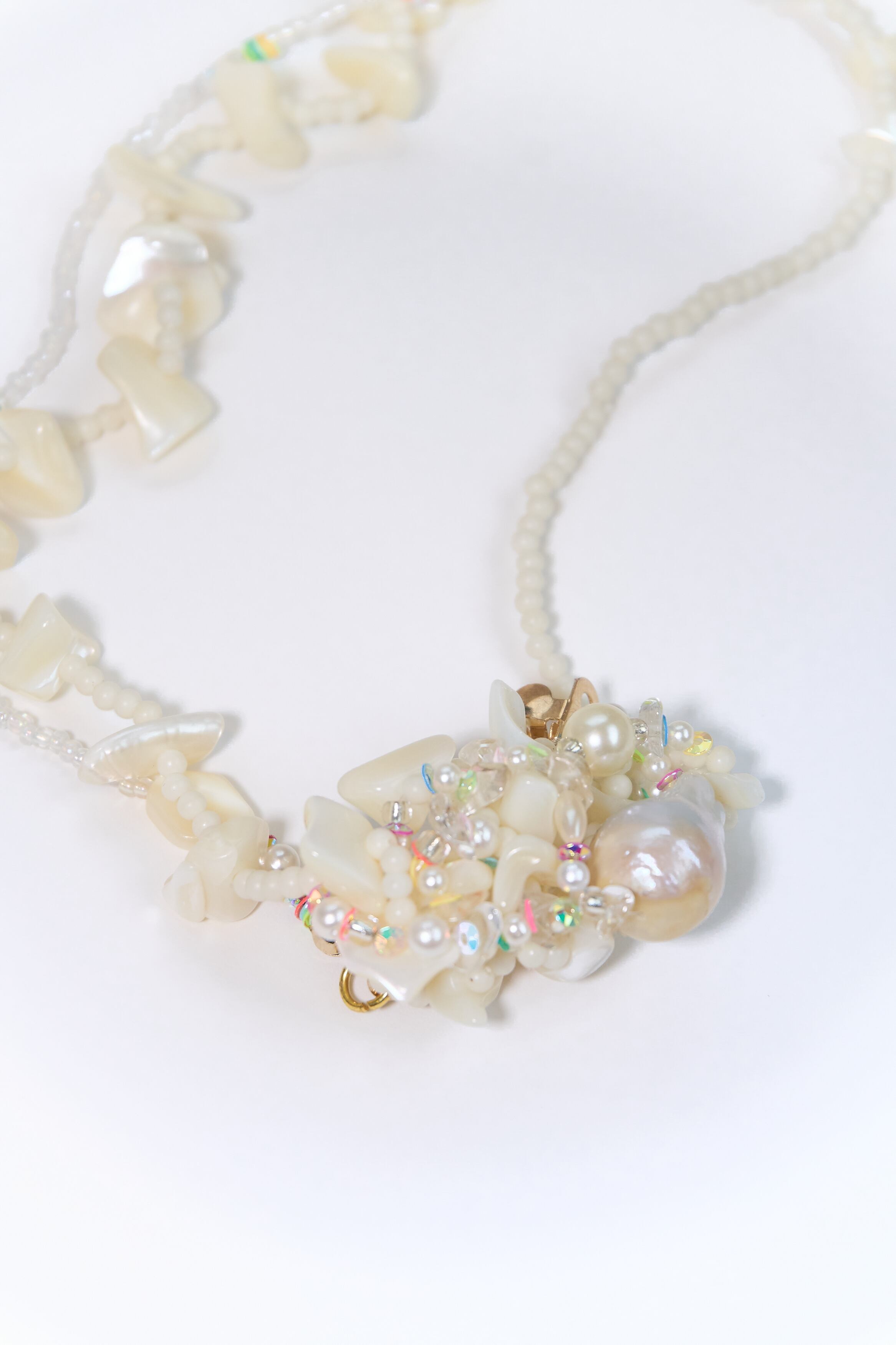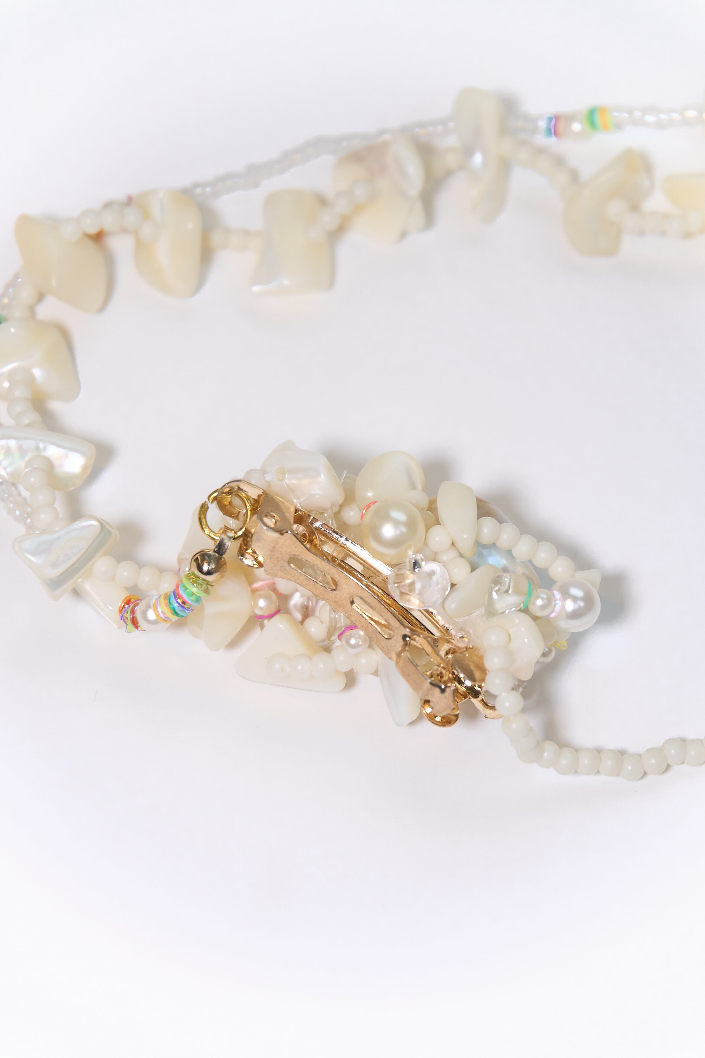 本体: ビーズ(ガラス等)、スパンコール、淡水パール、シェルパーツ、一部ヴィンテージパーツ使用のため組成の特性不可のものあり