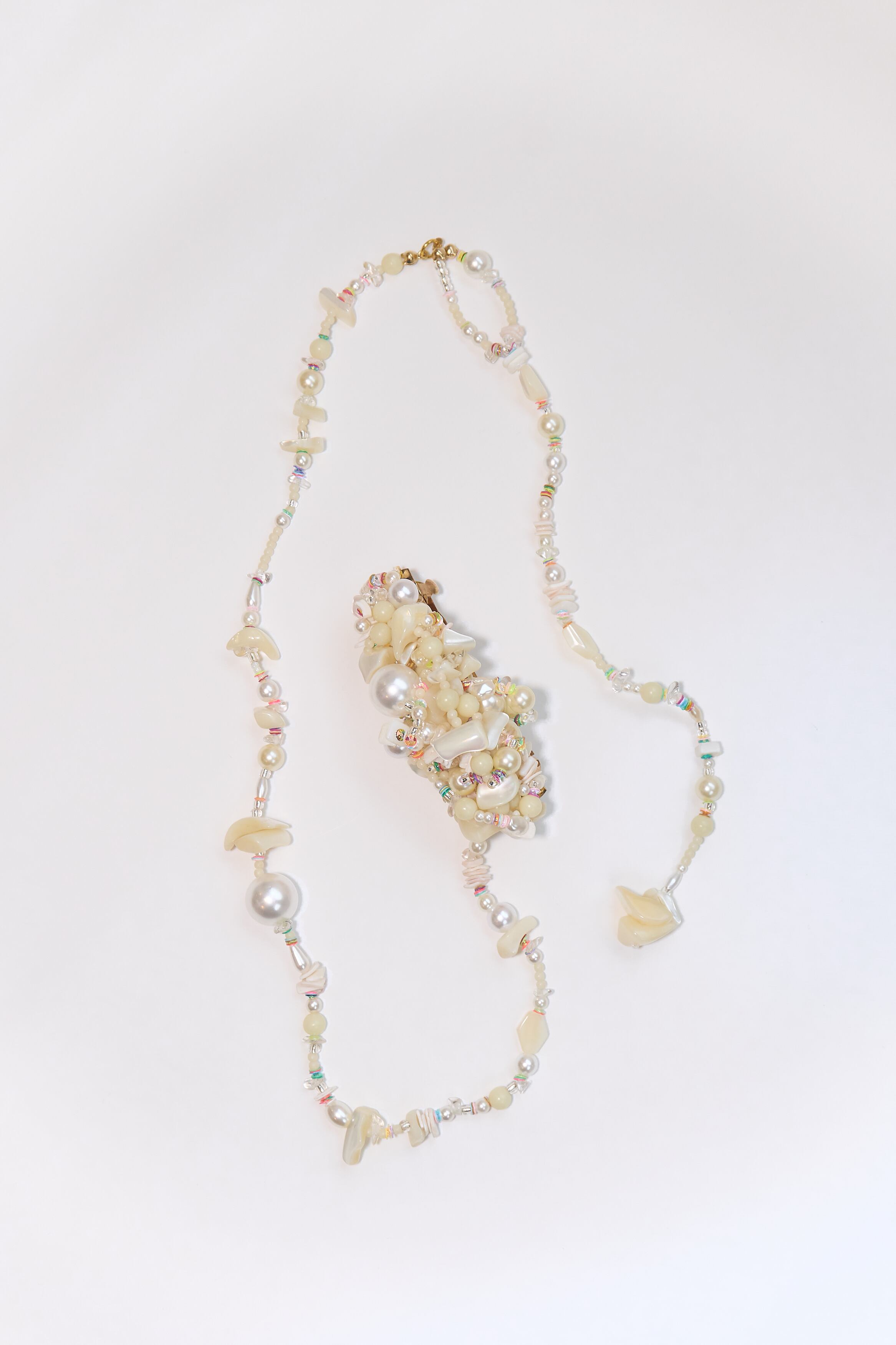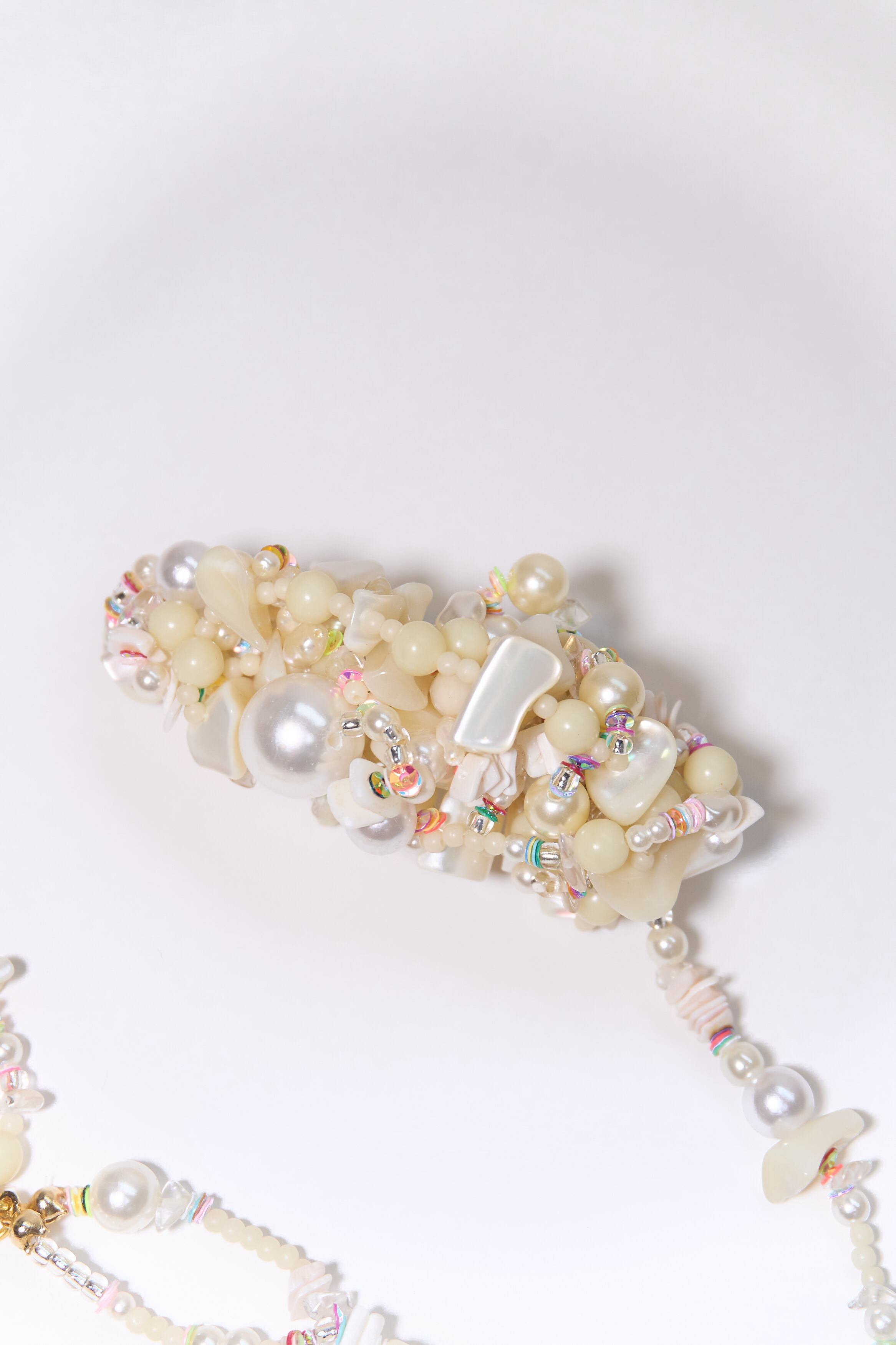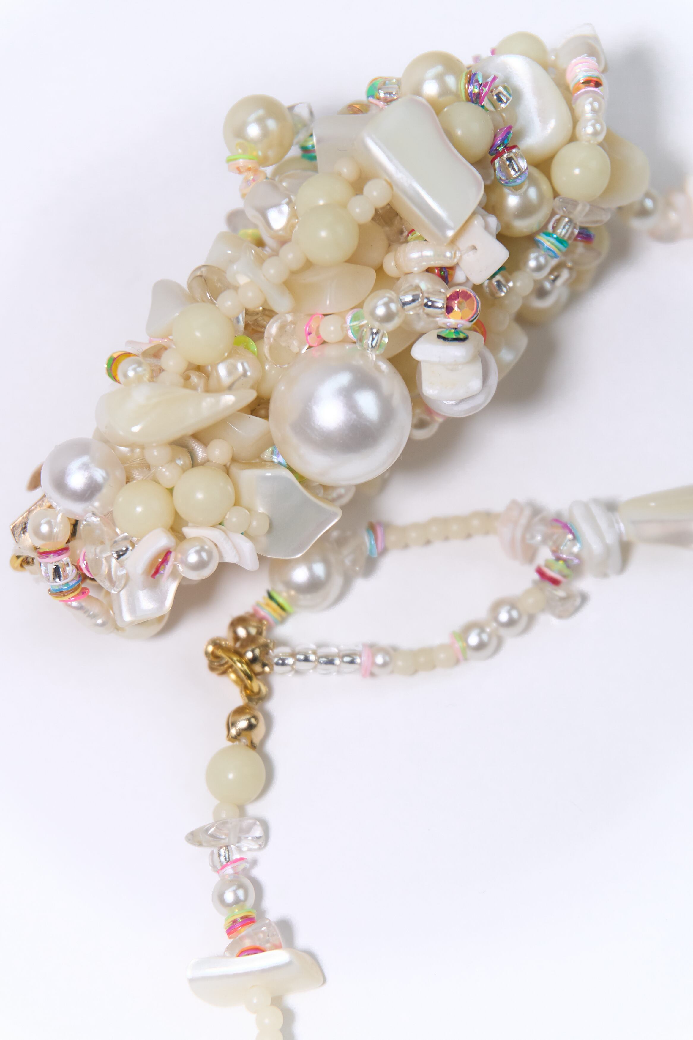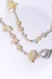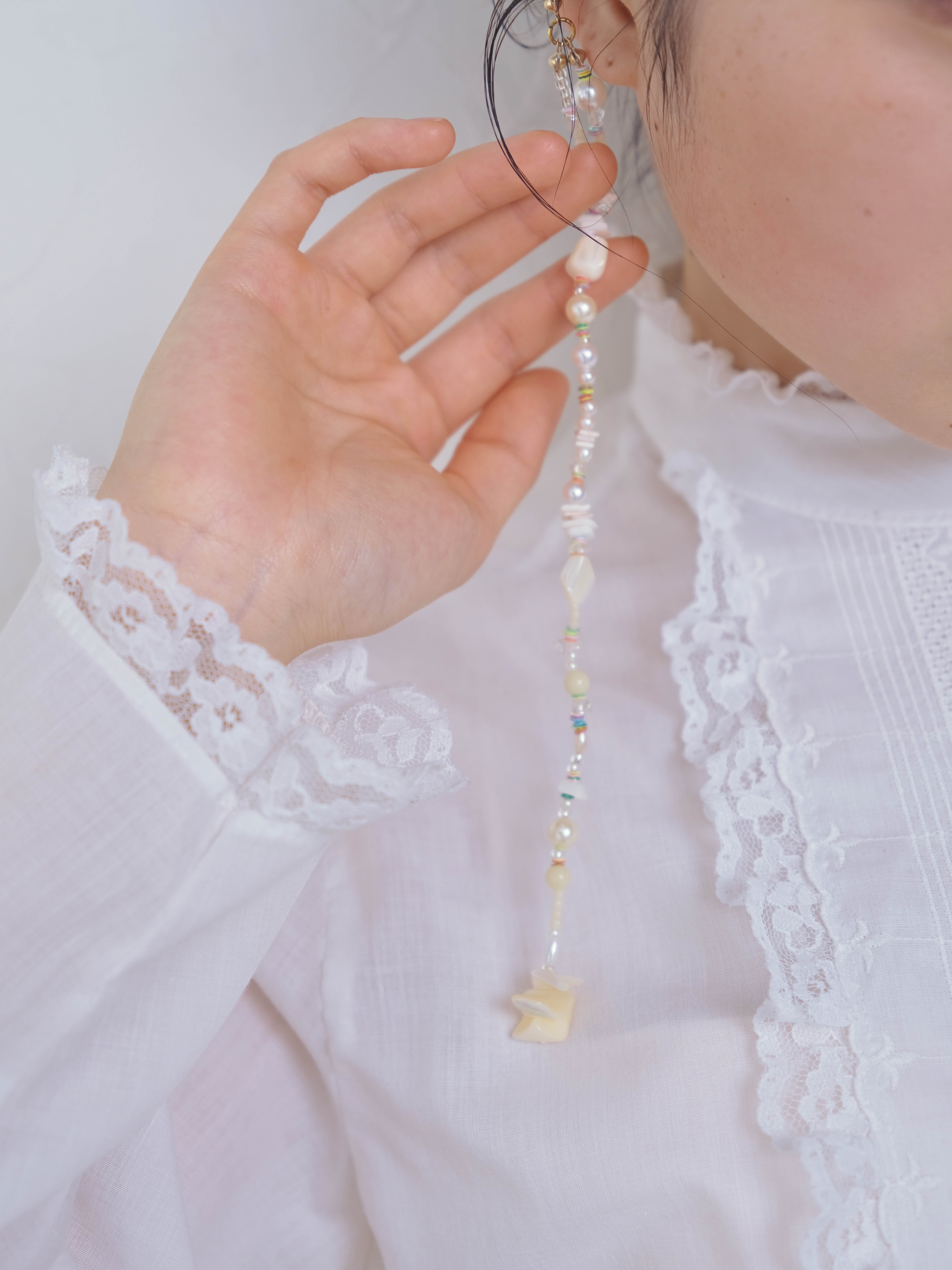 本体: ビーズ(ガラス等)、スパンコール、淡水パール、シェルパーツ、一部ヴィンテージパーツ使用のため組成の特性不可のものあり