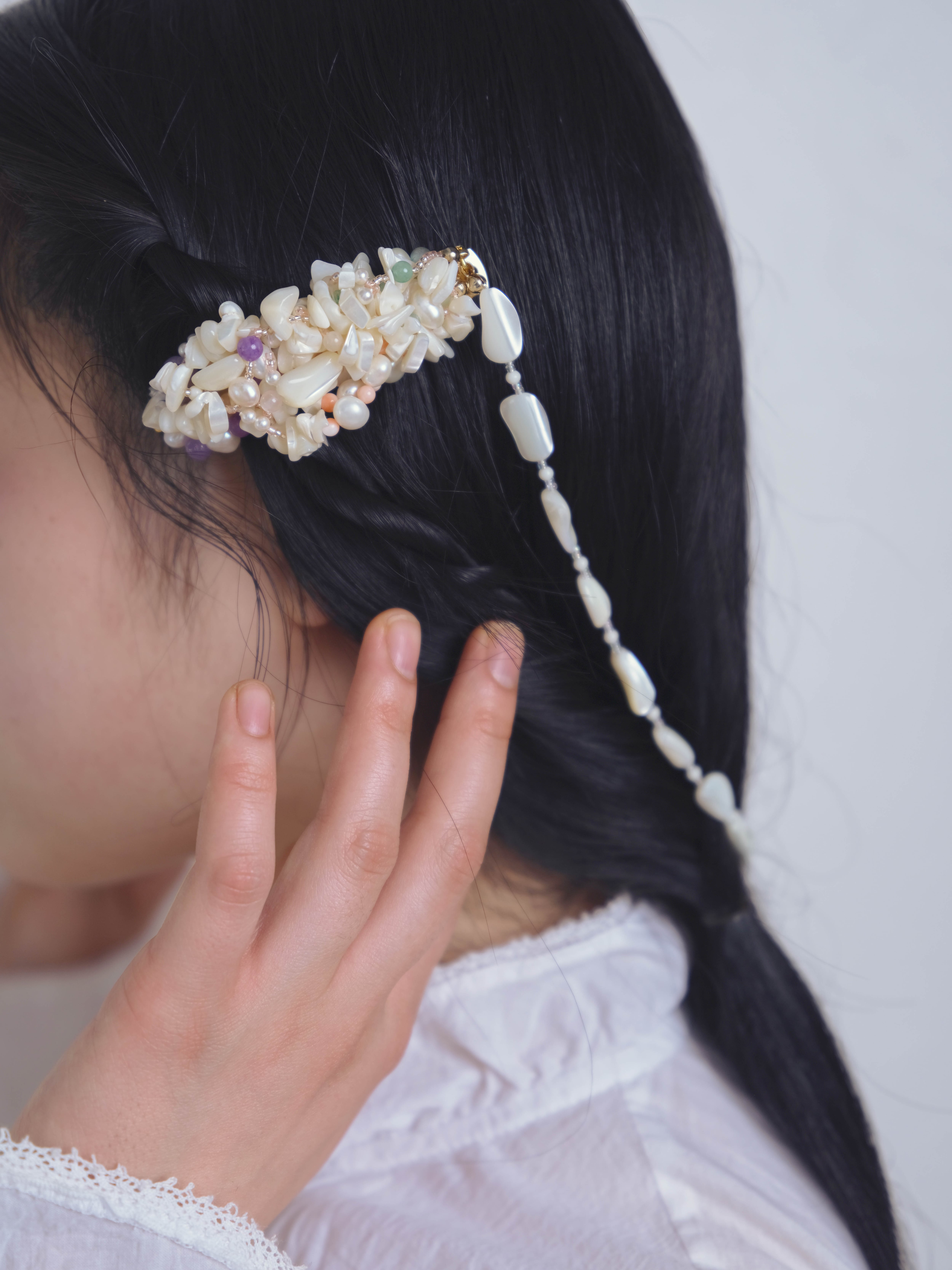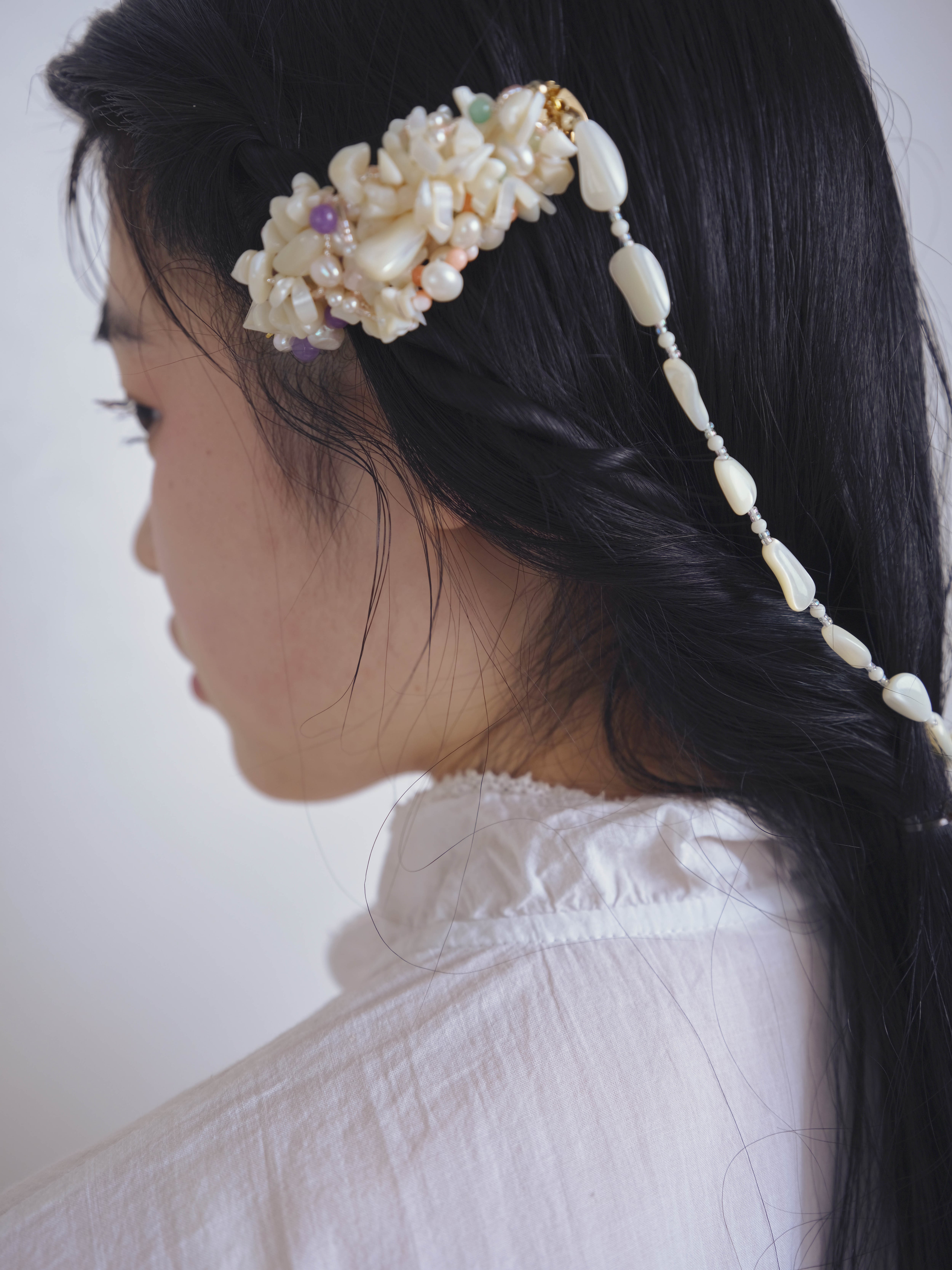 髪にも、首元にも、そっと寄り添うアクセサリーに仕立てました。