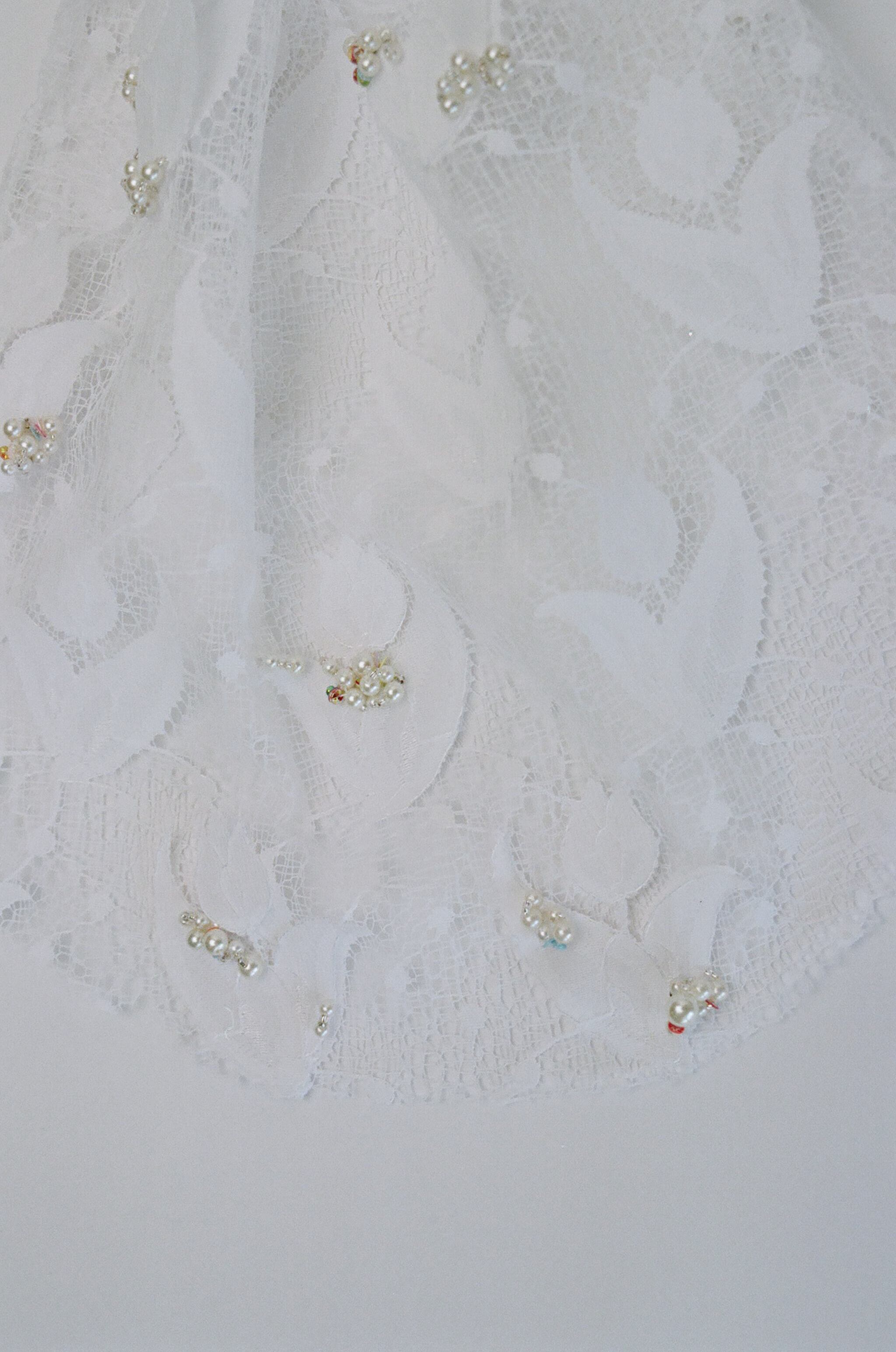 チューリップに立体感を持たせるためデザイナーが一つ一つ装飾と合わせて施したものとなっておりオンリーワンのレースとなっています。